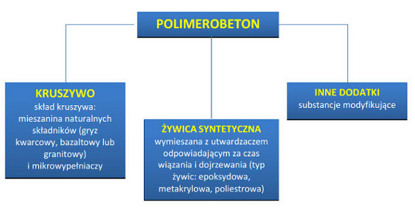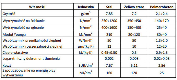 Dzięki wyeliminowaniu hydraulicznego spoiwa mineralnego, polimerobeton charakteryzuje się wysoką wytrzymałością mechaniczną oraz odpornością chemiczną na wiele agresywnych substancji. Cechą charakterystyczną betonu żywicznego w porównaniu do tradycyjnego betonu jest to, że jego parametry wytrzymałościowe bardzo często zbliżone są do parametrów skał rodzimych kruszywa jakie zostało wykorzystane w procesie produkcji. Własności polimerobetonu, stali i żeliwa zestawiono w tablicy 1 [1].