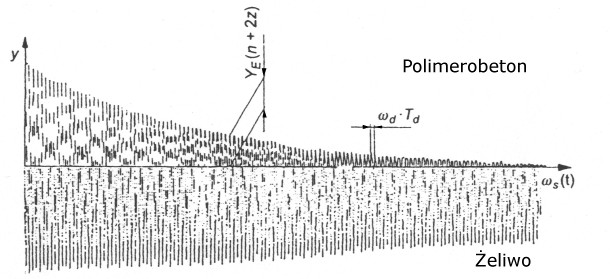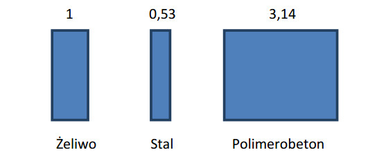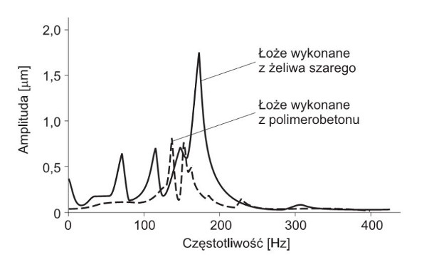 Jak wynika z porównania proporcji przekrojów aby uzyskać sztywność korpusu polimerowego analogiczną do korpusu żeliwnego masy obydwu konstrukcji będą zbliżone (gęstość polimerobetonu jest trzykrotnie mniejsza niż żeliwa). Zdecydowanie lepsze własności polimerobetonu widoczne są w tłumieniu drgań. Logarytmiczny dekrement tłumienia jest 7÷10 razy większy niż dla żeliwa i 10÷15 razy większy niż dla stali. Na rys. 4 przedstawiono porównanie charakterystyk amplitudowo-częstotliwościowych korpusu żeliwnego oraz korpusu wykonanego z polimerobetonu. Na rys. 5 przedstawiono porównanie tłumienia drgań korpusu żeliwnego i wykonanego z polimerobetonu w odpowiedzi na uderzenie. Po analogicznym czasie, kiedy drgania w korpusie polimerobetonowym już praktycznie się nie występują, w żeliwnym jeszcze są na wysokim poziomie.