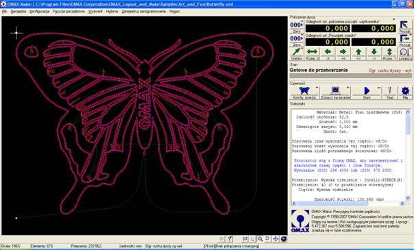 Żeby maszyna ruszyła, trzeba otworzyć wcześniej narysowany w Layoucie rysunek, lub po prostu otworzyć rysunek w dxf-ie przyniesiony - przysłany mailem - przez klienta. Wybiera się rodzaj materiału, grubość i jakość z jaką chcę ciąć i już, lecimy.
